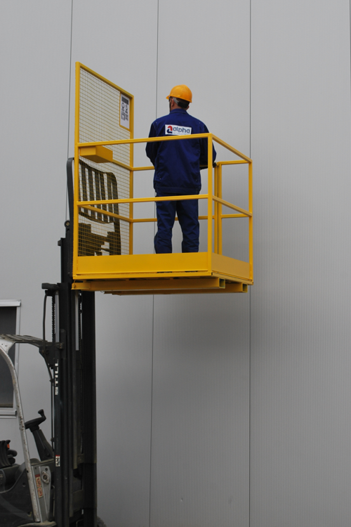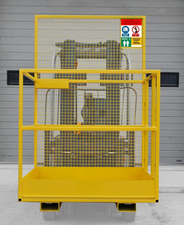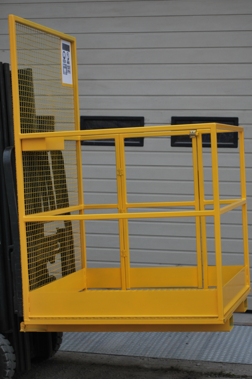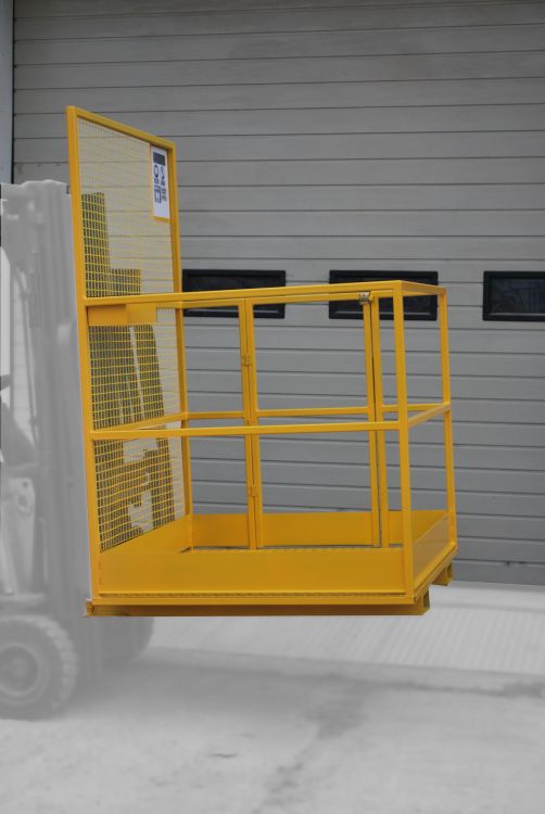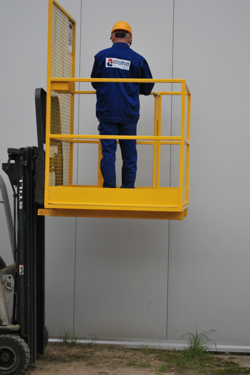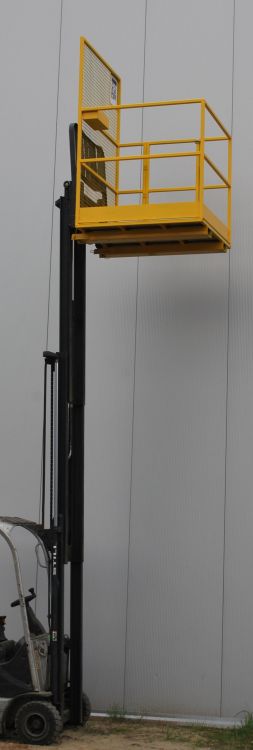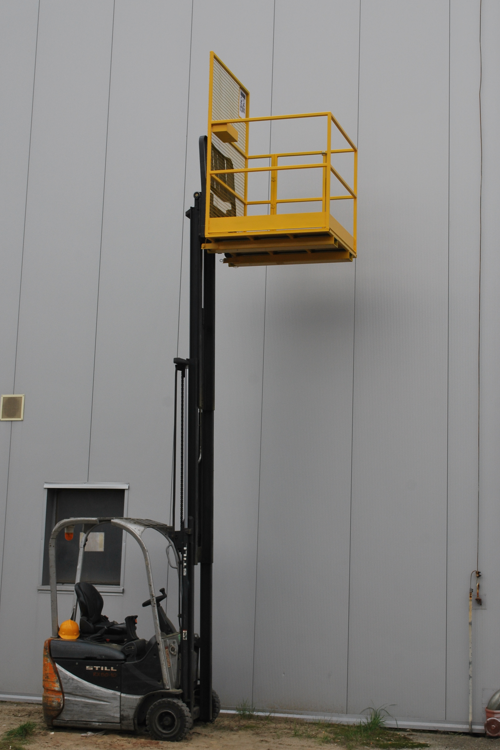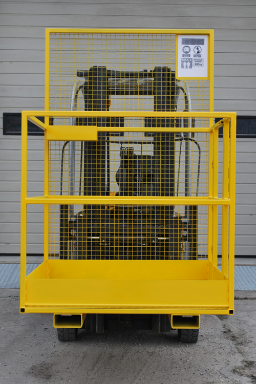 Arbeitsbühne für Gabelstapler. Plattform für Arbeit auf der Höhe gefertigt nach verbindlichen technischen Normen