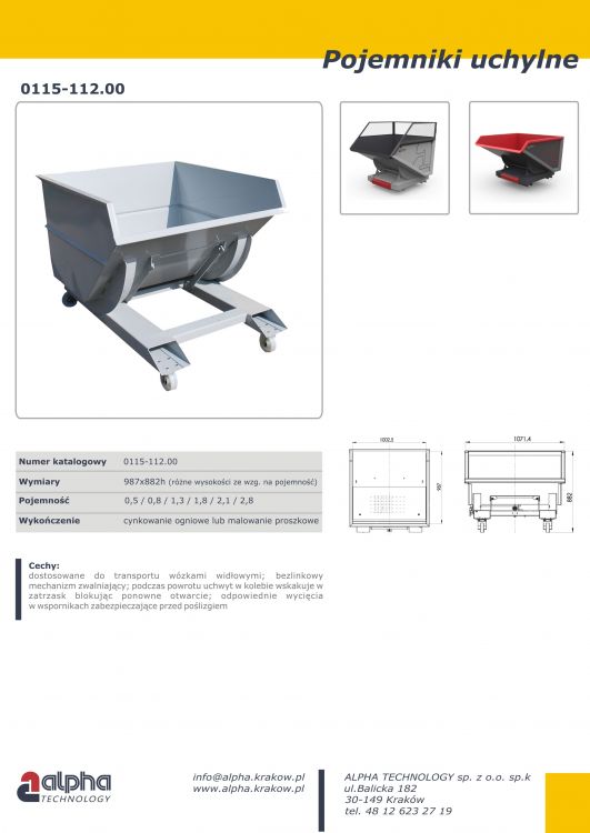Pojemniki kolebowe służą do magazynowania stacjonarnego oraz do przewozu i szybkiego rozładunku materiałów sypkich takich jak: odpady, złom, wióry, ścinki itp. Dostosowane są do transportu wózkami widłowymi.