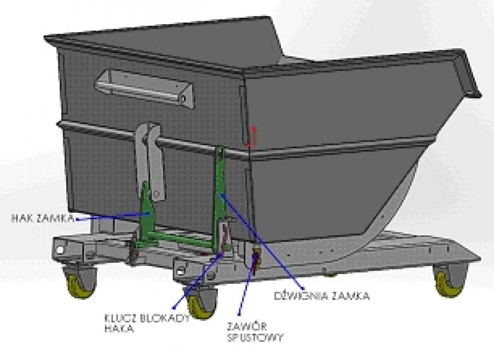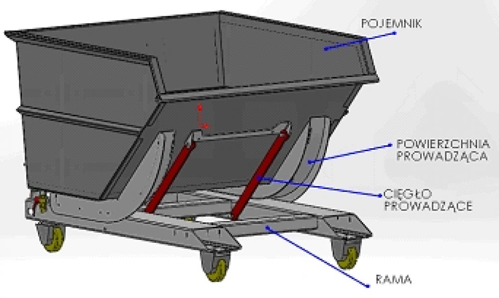 • umieszczonego na ramie pojemnika właściwego, który jest blokowany do ramy, a podczas przygotowania do rozładunku – po odblokowaniu może być przechylany. Przechylanie odbywa się poprzez przetaczanie kolistych powierzchni pojemnika po belkach ramy.